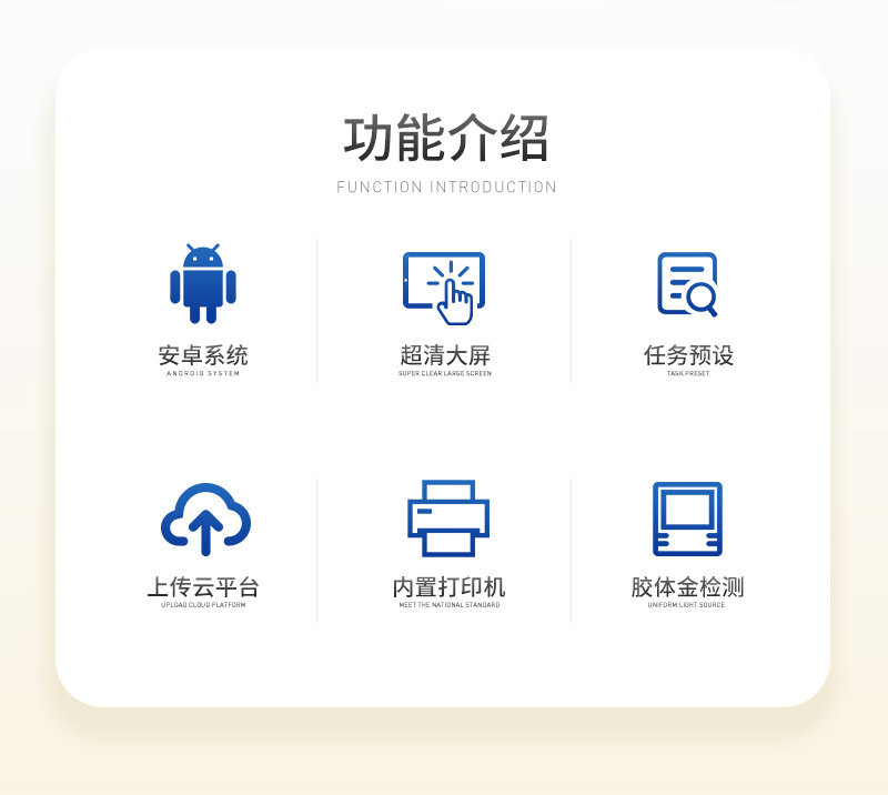 | 儀器采用10.1英寸液晶觸摸屏顯,搭配運行安卓智能操作系統,主控芯片采用ARM Cortex-A7,RK3288/4核處理器,主頻1.88Ghz,運轉速度更快速,性能更強。 | 儀器功能包括:膠體金檢測模塊、數字化管理模塊、無線通訊模塊等,可以滿足同一軟件下實現所有檢測項目的檢測,并在同一窗口展示檢測結果。 | 一體化便攜式快檢設備,采用交直流兩用供電方式,可連接車載電源,配備6ah大容量充電鋰電池,可以滿足現場及流動檢測使用的需求。儀器尺寸:43×35×20cm, 主機凈重:5.1kg | ★系統自帶數據集成模塊,設備首頁自動統計檢測數據包含:周檢測數據、月檢測數據,全部檢測總數量,均包含檢測總數,合格數,不合格數,以及相關柱形分析圖,對各項檢測數據清晰掌握,無需電腦查詢,更加快捷直觀。 | 軌道式自動傳輸掃描方式,可實時顯示金標卡實時圖像,系統自動分析并呈現出CT曲線圖,CT線自動識別,無需手動調整,完成檢測后自動退出檢測卡。 | 結果判定線可修改,對照值標定值可保存,斷電不丟失數據。 | 兼容市場上其他膠體金卡,使用耗材不受限制,極大增強用戶使用體驗。 | 儀器檢測系統擁有龐大數據庫,并且構建了完善的檢索、修訂功能。 | 食品庫涵蓋多種樣品名稱,可按需添加或刪除、編輯樣品名稱; | 產品數據庫以及歷史檢測記錄支持一鍵檢索功能。 | 系統打印自定義化,打印格式多樣化,產品合格證(****要求),二維碼,抽樣信息、檢測信息,受檢信息、復核信息、抽樣日期、檢測日期等信息結果,可按需求自行設置打印內容。 | 內置限量規判程序:具有限量查詢、添加物質合規判定系統。檢測出結果后,系統自動調用系統數據庫中相關國標進行比對判定,客觀顯示判定結果是否合格,檢測對象是否允許添加該物質,若允許添加則能準確獲得食品中添加該物質的限量及添加依據的****。 | 儀器具有 wifi 聯網上傳、RJ45網線連接功能,可以快速上傳數據。同步對接監管平臺,數據可局域網和互聯網數據上傳,檢測結果直接傳至食品安全監管平臺。進行區域食品安全監管及大數據分析處理與數據統計,檢測區域食品安全長短期動態,達到食品安全問題預估、預警。 | 設備支持U盤存儲,標準USB接口,免驅動安裝。檢測結果存儲容量20萬條以上,可生成Excel表格,進行一鍵拷貝,并具有登錄保護功能,可設置用戶名及密碼,規范不同人員操作權限,防止非工作人員操作,并且可以進行重新校準、鎖定、恢復出廠設置功能。儀器固件可升級,后期檢測項目可擴充。 | 儀器加入遠程升級功能,可定向分客戶分儀器更新,開機后自動更新,客戶無需任何操作,即可升級全新項目。做到了無需退換機器即可實現實時遠程升級檢測儀器。 | 可連接外部打印機,打印A4紙規格的檢測報告(可選配) |