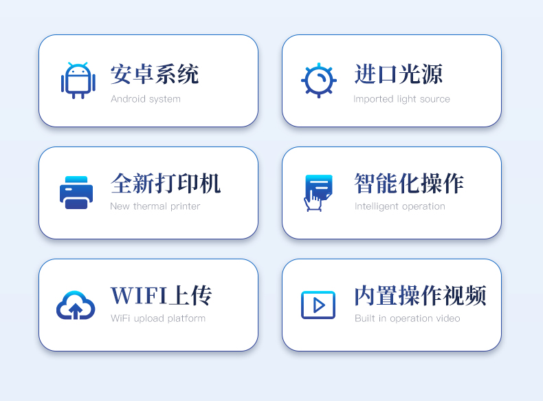 | 主控芯片采用ARM Cortex-A7,RK3288/4核處理器,主頻1.88Ghz,運轉速度更快速,穩(wěn)定性更強。 | 顯示方式:7英寸液晶觸摸屏顯示,人性化中文操作界面,讀數(shù)直觀、簡單。 | 直流12V供電,可連接車載電源,可配6ah大容量充電鋰電池,方便戶外流動測試。 | 雙波長冷光源,每個通道均配置405、528nm波長光源,標配**的光路切換裝置,專利光路切換功能可實現(xiàn)*多64波長,并且所有檢測項目可實現(xiàn)所有通道同時檢測。 | 光源亮度自動調節(jié)與校準 | 智能恒流穩(wěn)壓,光強自動校準,長時間連續(xù)工作光源無溫漂現(xiàn)象。 | 內(nèi)置新國家限量標準,與所測結果進行現(xiàn)場比對,并持續(xù)更新標準。 | 不間斷進樣,連續(xù)檢測 | 樣本編號自動累加 | 檢測項目可擴充。 | 檢測結果可批量打印,批量上傳。 | 檢測結果為Excel表格,連接電腦即可拷貝。 | 支持U盤存儲,標準USB接口,免驅動安裝。 | 可配置大容量鋰電池,固件可升級 |