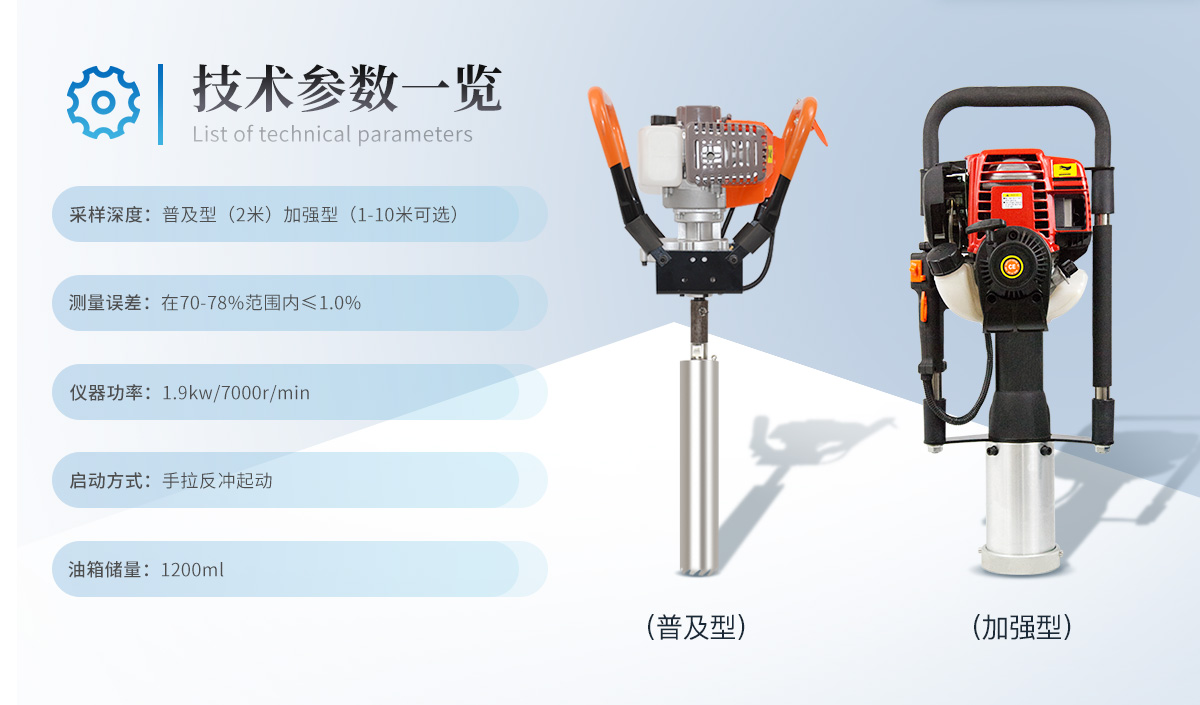 | 規(guī) 格: 采樣直徑5.1cm、一次采樣長度25cm(鉆頭可根據(jù)要求定做) | 采樣深度:2米,延長桿插銷連接。 | 發(fā)動機形式:風冷單缸二沖程 | 發(fā)動機排量:52CC | 發(fā)動機功率:1.9kw/7000r/min | 齒輪箱配置:采用齒輪二級變速,軸承轉動 | 傳動方式:齒輪變速傳動 | 啟動方式:手拉反沖起動 | 燃油比:93號汽油與二沖程機油25:1 | 燃油箱容積:1200ml | 凈 重:20kg |