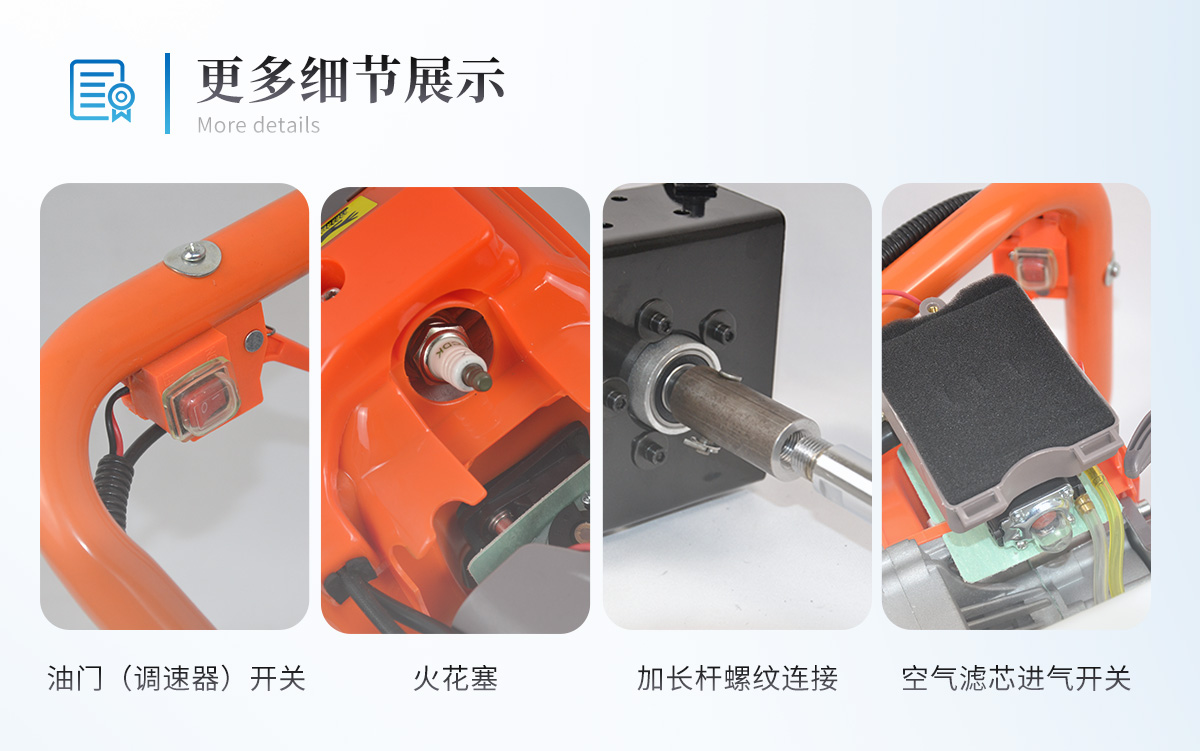 | 汽油機(動力增至52CC,馬力更強勁!) 一臺 | 磚頭(插銷連接、開口設計) 一個 | 延長桿(長:50CM,插銷連接) 4根 | 刮刀 一把 | 鋼卷尺(3米) 一個 | 手套 一雙 | 合格證 一份 | 說明書 一份 | 杠桿(輔助提取設備) 一只 | 便攜包 一支 | 鋁箱 一個 |