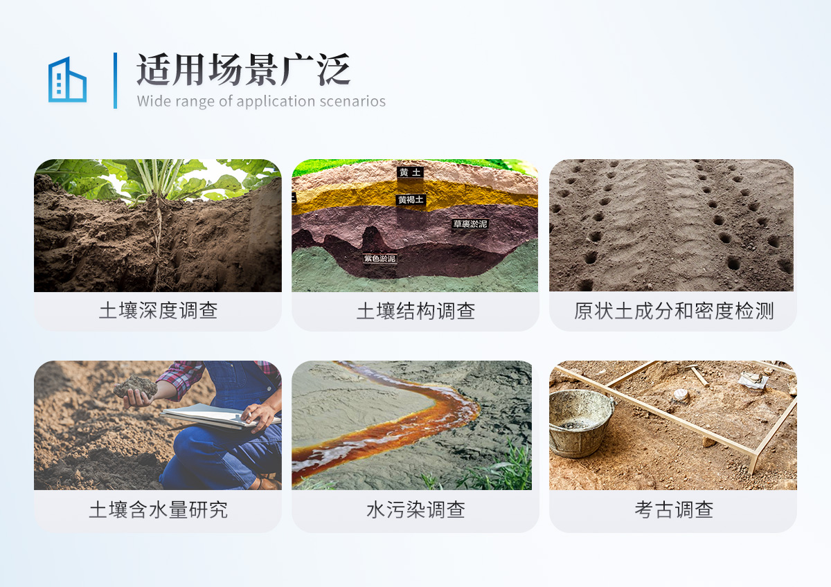 | 土壤結構描述 | 調查根系情況,獲取深度和密實度對根部影響 | 檢測原狀土的成分和密度 | 對長期作業(yè)的土壤研究其含水量和溶解物質情況 | 對水的流動和溶解物質的研究,如土壤中水分快速流失現(xiàn)象 | 考古調查 |