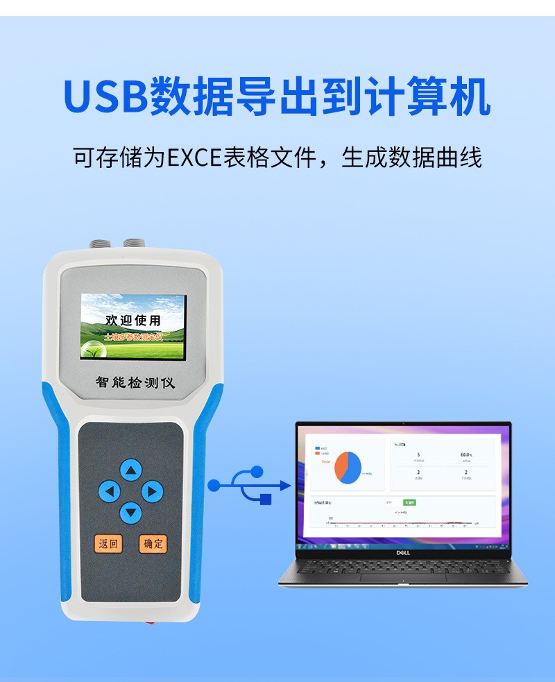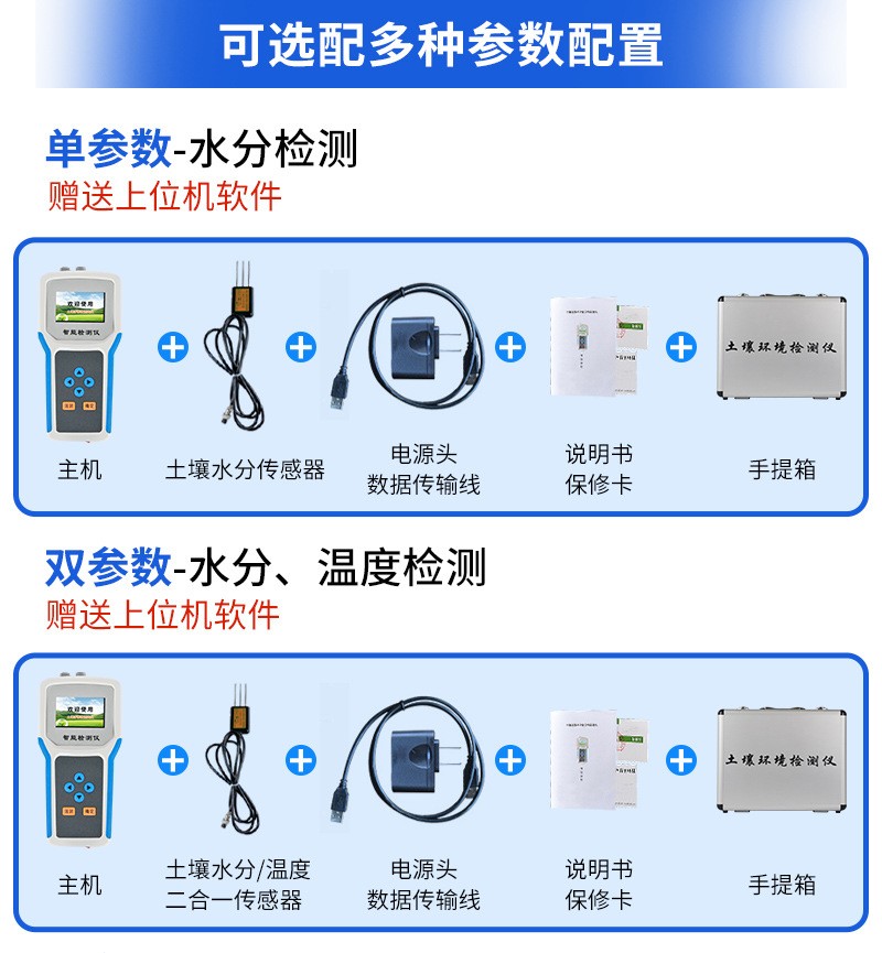 | 儀器可加配4G聯網功能和數據管理平臺,將本機存儲的歷史數據無線上傳到智慧云農業平臺,方便用戶進行數據管理和長期分析。 | 可選擇記錄模式:手動記錄、自動記錄,自動記錄可設置記錄時間間隔。 | 采用一體化結構設計,集液晶顯示儀表+傳感器+便攜手提箱合成在一個便攜式手提箱內,本機體積小巧,操作簡單,性能可靠,野外攜帶極為方便。 | 大屏幕中文液晶顯示,可實時顯示溫度值、水分值、組數、低電壓示警,存儲數據等,便于野外攜帶作業。 | 儀表可設置多種土質配方,便于不同土質的水分測量。 | 能存儲指定各個點的土壤溫度值、水分值,上位機軟件功能強大,隨時可以通過USB接口將記錄中的數據導出到計算機上,并可以存儲為EXCE表格文件,生成數據曲線,以供其它分析軟件進一步進行數據處理。 |