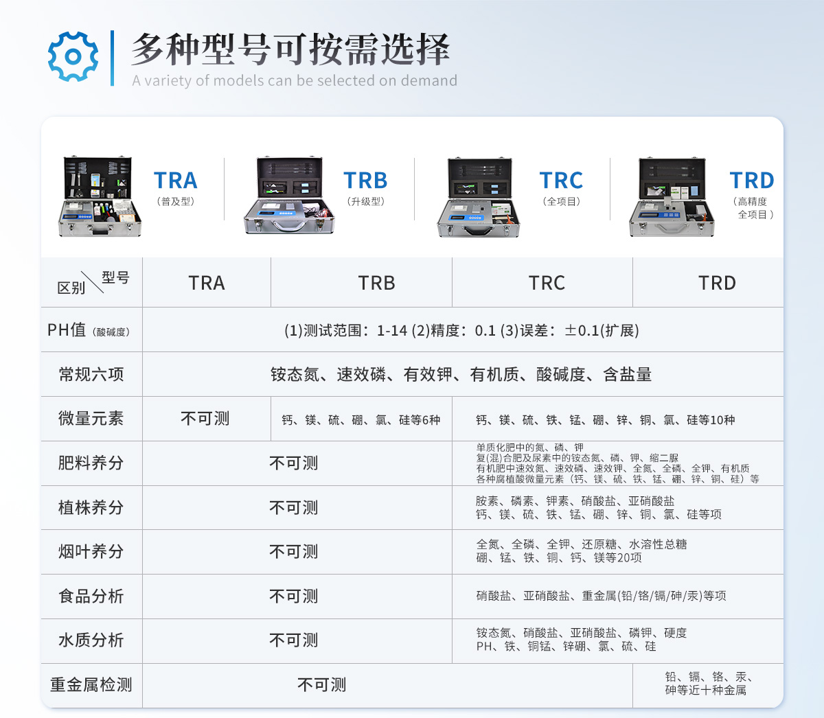| 土壤養(yǎng)分:● 銨態(tài)氮、速效磷、速效鉀、水份、有機質、酸堿度(pH試紙法)等項; | 肥料養(yǎng)分:● 單質化肥中的氮、磷、鉀; ● 復(混)合肥及尿素中的銨態(tài)氮、磷、鉀; ● 有機肥中速效氮、速效磷、速效鉀、全氮、全磷、全鉀、pH、有機質等。 |