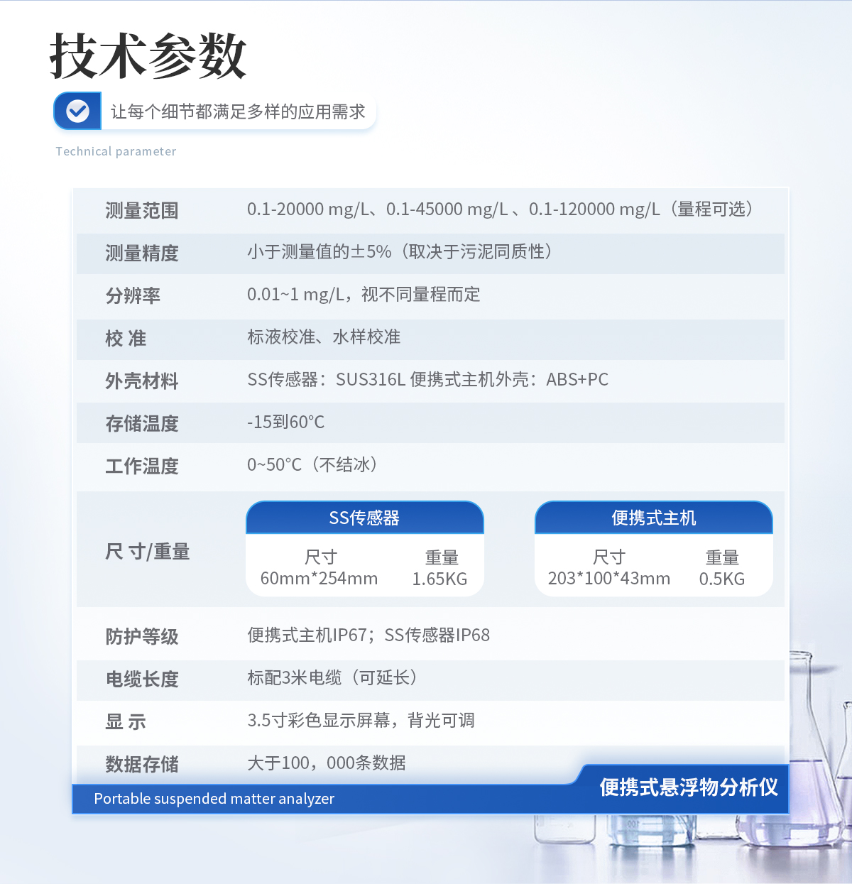 | 測量范圍:0.1-20000 mg/L、0.1-45000 mg/L 、0.1-120000 mg/L(量程可選) | 測量精度:小于測量值的±5%(取決于污泥同質性) | 分辨率:0.01~1 mg/L,視不同量程而定 | 校 準:標液校準、水樣校準 | 外殼材料:SS傳感器:SUS316L 便攜式主機外殼:ABS+PC | 存儲溫度:-15到60℃ | 工作溫度:0~50℃(不結冰) | 尺 寸/重量:SS傳感器尺寸:直徑60mm*長度 254mm 重量:1.65KG 便攜式主機尺寸:203*100*43mm,重量:0.5KG | 防護等級:便攜式主機IP67;SS傳感器IP68 | 電纜長度:標配3米電纜(可延長) | 顯 示:3.5寸彩色顯示屏幕,背光可調 | 數據存儲:大于100,000條數據 |