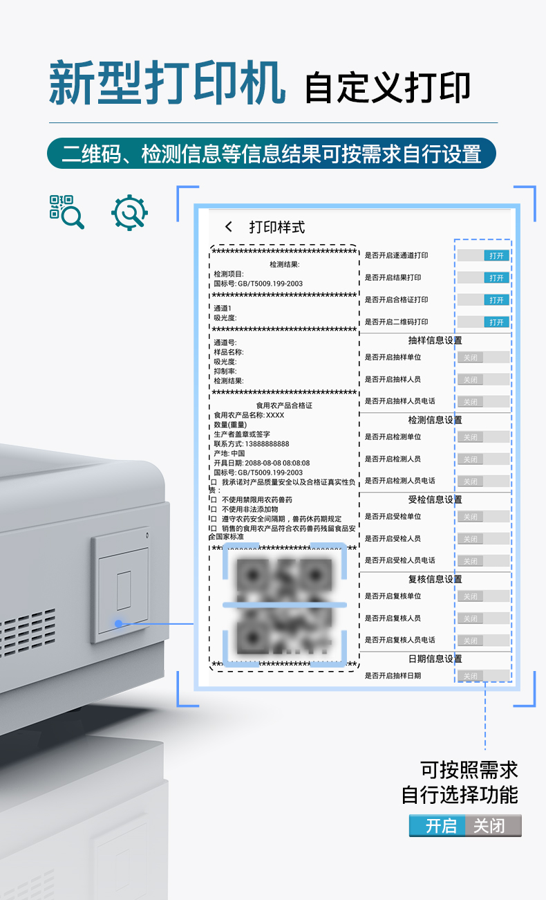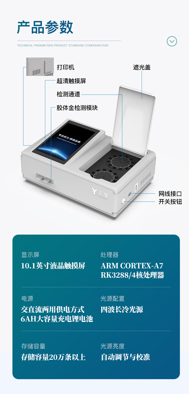 儀器采用臺式一體化系統檢測技術,將分光光度模塊、膠體金檢測模塊、新型農殘檢測模塊、數字化管理模塊、無線通訊模塊高度集成于一體,支持檢測200種食品安全檢測項目,同時預留升級檢測方法。儀器檢測模塊標準化、智能化,可隨意自由組合。檢測箱體內置多個標準檢測單元,檢測模塊可以調整配置。 儀器采用全新安卓智能系統,主控芯片采用 ARM Cortex-A7,RK3288/4核處理器,10.1寸高清液晶觸摸豎屏,更加**的UI交互界面,運轉快捷;儀器配備無線通信模塊: 4G(APN)通訊模塊、Wifi模塊,藍牙傳輸,同時具有雙USB接口以及RJ45接口能以多種方式實現數據保存和數據傳輸功能。創新檢測模式★檢測通道:≥12通道;采用精密旋轉比色池設計,使用同芯片同光源校準精度,解決不同光源之間的誤差值。1-12通道間誤差0.1%。(***:**202022821055.2) ★儀器具有自動識別比色皿檢測功能,即:將樣品比色皿放入儀器后,點擊樣品檢測,儀器自動識別比色皿進行通道檢測。進口高精光源:高精度進口四波長冷光源,通道配置 410、520、590、630nm 波長光源,一個光源芯片驅動一個光源,誤差極小,每臺設備單獨**校準光源,**比對,同時參照四種不同波段光源全方位覆蓋市面上99%的農殘食品項目檢測。膠體金模塊檢測方式:★采用COMS實時成像技術,可采集多個畫面,支持2個金標同時讀卡,通過不同顏色的灰度變化,一秒精準得出結果。智能操作分析系統:★便捷操作系統:設備檢測時可在同一檢測界面自動對應相關檢測通道一次性選擇1-12個樣品名稱,無須退出界面,節省操作時間。(需提供對應證明) ★數據集成系統:設備首頁自動統計檢測數據包含:周檢測數據、月檢測數據,全部檢測總數量,均包含檢測總數,合格數,不合格數,以及相關柱形分析圖,對各項檢測數據清晰掌握,無需電腦查詢,更加快捷直觀。(需提供對應證明文件)★項目預設系統:支持添加單個及多個相同或不相同的任務預設,一鍵快速調取,每一個任務分別可以設置不同的樣品、批次、編號、來源、備注、抽樣信息、檢測信息、受檢信息、復核信息等更多信息。無縫鏈接平臺和APP實時查看下發任務。(需提供對應證明文件)★數據監管系統:同步對接監管平臺,數據可局域網和互聯網數據上傳,檢測結果可選擇直接傳至食品安全監管平臺。集成OSS輸出存儲服務、區分設備定向管理應用,進行區域食品安全監管及大數據分析處理與數據統計,檢測區域食品安全長短期動態,達到食品安全問題預估、預警。(需提供對應食品理化分析系統計算機軟件著作權)。★ 自定義打印系統:內置全新打印系統,新創自定義打印方式,可按需靈活設置開啟或關閉:產品合格證(國家農業部標準要求),二維碼,抽樣信息、檢測信息,受檢信息、復核信息、抽樣日期、檢測日期等信息的打印。(需提供對應證明)★系統遠程更新功能:可定向分客戶分儀器更新系統,按照不同客戶后期實際需求添加項目,無需機器返廠,即可遠程實時升級全新系統,節省時間成本及避免運輸造成設備損壞。儀器主機采用一體化防水、抗壓、防撞擊、防腐蝕箱體設計,同時配備交直流供電,可連接車載電源,可選配大容量充電鋰電池,滿足現場野外檢測需求。安全證書,放心保障:儀器具有中國計量科學研究院校準證書,權威認證。