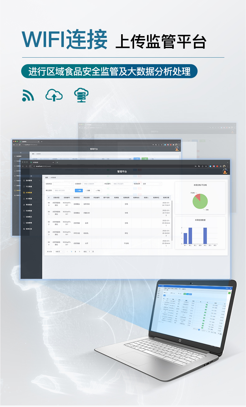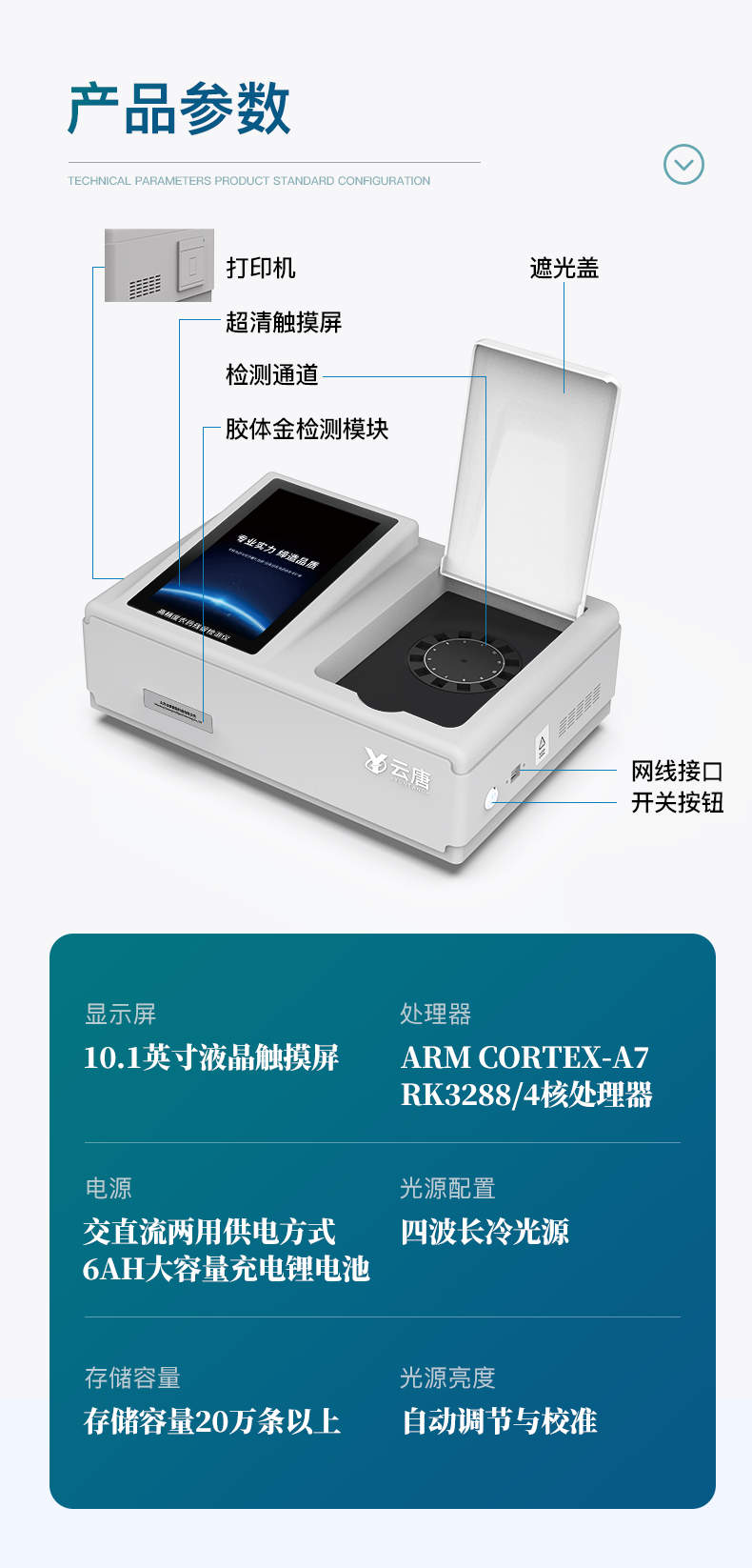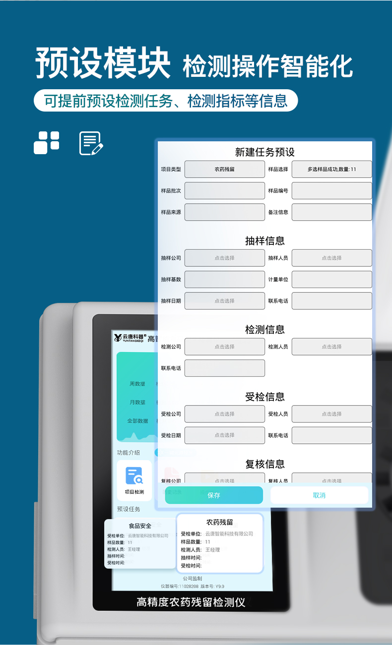 | 1)儀器采用臺式一體化系統(tǒng)檢測技術(shù),新型農(nóng)殘檢測模塊、數(shù)字化管理模塊、無線通訊模塊高度集成于一體,同時預(yù)留升級檢測方法。 | 2)儀器檢測模塊標準化、智能化,可隨意自由組合。檢測箱體內(nèi)置多個標準檢測單元,檢測模塊可以調(diào)整配置。 | 3)儀器采用全新安卓智能系統(tǒng),主控芯片采用 ARM Cortex-A7,RK3288/4核處理器,10.1寸高清液晶觸摸豎屏,更加**的UI交互界面,運轉(zhuǎn)快捷;儀器配備無線通信模塊: 4G(APN)通訊模塊、Wifi模塊,藍牙傳輸,同時具有雙USB接口以及RJ45接口能以多種方式實現(xiàn)數(shù)據(jù)保存和數(shù)據(jù)傳輸功能。 | 4)創(chuàng)新檢測模式:檢測通道:≥24通道;采用精密旋轉(zhuǎn)比色池設(shè)計,使用同芯片同光源校準精度,解決不同光源之間的誤差值。1-12通道間誤差0.1%。(***:**202022821055.2) 儀器具有自動識別比色皿檢測功能,即:將樣品比色皿放入儀器后,點擊樣品檢測,儀器自動識別比色皿進行通道檢測。 | 5)進口高精光源:高精度進口四波長冷光源,通道配置 410、520、590、630nm 波長光源,一個光源芯片驅(qū)動一個光源,誤差極小,每臺設(shè)備單獨**校準光源,**比對,同時參照四種不同波段光源全方位覆蓋市面上99%的農(nóng)殘食品項目檢測,可按照實際需求進行食品項目檢測升級。 | 6)智能操作分析系統(tǒng): | 6.1.便捷操作系統(tǒng):設(shè)備檢測時可在同一檢測界面自動對應(yīng)相關(guān)檢測通道一次性選擇1-24個樣品名稱,無須退出界面,節(jié)省操作時間。 | 6.2.數(shù)據(jù)集成系統(tǒng):設(shè)備首頁自動統(tǒng)計檢測數(shù)據(jù)包含:周檢測數(shù)據(jù)、月檢測數(shù)據(jù),全部檢測總數(shù)量,均包含檢測總數(shù),合格數(shù),不合格數(shù),以及相關(guān)柱形分析圖,對各項檢測數(shù)據(jù)清晰掌握,無需電腦查詢,更加快捷直觀。 | 6.3.項目預(yù)設(shè)系統(tǒng):支持添加單個及多個相同或不相同的任務(wù)預(yù)設(shè),一鍵快速調(diào)取,每一個任務(wù)分別可以設(shè)置不同的樣品、批次、編號、來源、備注、抽樣信息、檢測信息、受檢信息、復(fù)核信息等更多信息。 | 6.4.數(shù)據(jù)監(jiān)管系統(tǒng):同步對接監(jiān)管平臺,數(shù)據(jù)可局域網(wǎng)和互聯(lián)網(wǎng)數(shù)據(jù)上傳,檢測結(jié)果可選擇直接傳至食品安全監(jiān)管平臺。集成OSS輸出存儲服務(wù)、區(qū)分設(shè)備定向管理應(yīng)用,進行區(qū)域食品安全監(jiān)管及大數(shù)據(jù)分析處理與數(shù)據(jù)統(tǒng)計,檢測區(qū)域食品安全長短期動態(tài),達到食品安全問題預(yù)估、預(yù)警。 | 6.5.自定義打印系統(tǒng):內(nèi)置新創(chuàng)自定義打印系統(tǒng),可按需靈活設(shè)置開啟或關(guān)閉:產(chǎn)品合格證(國家農(nóng)業(yè)部標準),二維碼,抽樣信息、檢測信息,受檢信息、復(fù)核信息、抽樣日期、檢測日期等信息的打印。 | 6.6.A4版本報告打印功能:設(shè)備可自動生成A4版報告,外接打印機即可打印 | 6.7.系統(tǒng)遠程更新功能:可定向分客戶分儀器更新系統(tǒng),按照不同客戶后期實際需求添加項目,無需設(shè)備返廠,即可遠程實時升級全新系統(tǒng),節(jié)省時間成本及避免運輸造成設(shè)備損壞。 | 7)安全證書,放心保障:儀器具有中國計量科學(xué)研究院校準證書,權(quán)威認證。 |