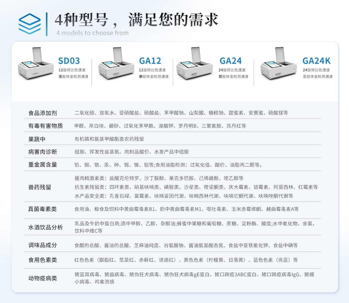 | 食品添加劑:二氧化硫、雙氧水、亞硝酸鹽、硝酸鹽、苯甲酸鈉、山梨酸鉀、糖精鈉、甜蜜素、木耳硫酸鎂等 | 有毒有害物質:甲醛、吊白塊、硼砂、過氧化苯甲酰、溴酸鉀、羅丹明B、三聚氰胺、蘇丹紅、工業堿、尿素、明礬等 | 果蔬:農藥殘留(酶抑制率法) | 病害肉:組胺、揮發性鹽基氮 | 重金屬含量:鉛、鎘、鉻、汞、砷、錫、鎳、鋁等 | 水酒飲品分析:酒中甲醇、乙醇、乳品及牛奶中蛋白質 | 調味品成分: 食醋的總酸、醬油的總酸、芝麻油純度、谷氨酸鈉、醬油氨基酸態氮、食鹽中亞鐵氰化鉀、食鹽中碘等 | 食用色素類:紅色色素(胭脂紅、莧菜紅、莧菜紅)、黃色色素(檸檬黃、日落黃)、藍色色素(亮藍)等 | 蜂蜜成分:果糖和葡萄糖、蔗糖、淀粉酶、酸度等 | 食用油脂:過氧化值、酸價等 |