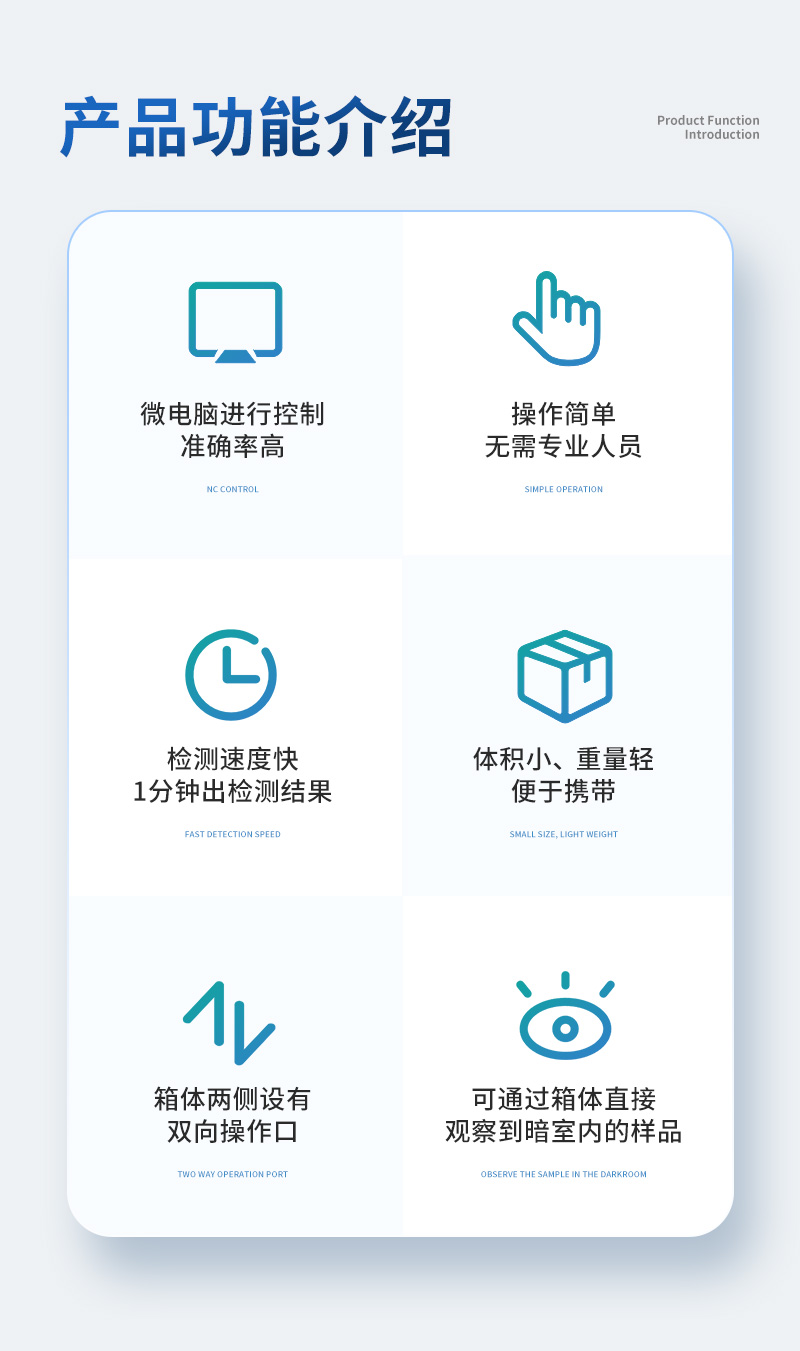 | ★1、采用微電腦進行控制,準確率高 | ★2、操作簡單,無需專業人員 | ★3、檢測速度快,1分鐘出檢測結果 | ★4、體積小、重量輕、便于攜帶 |