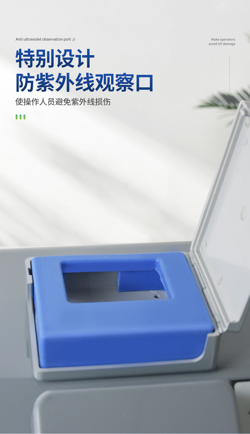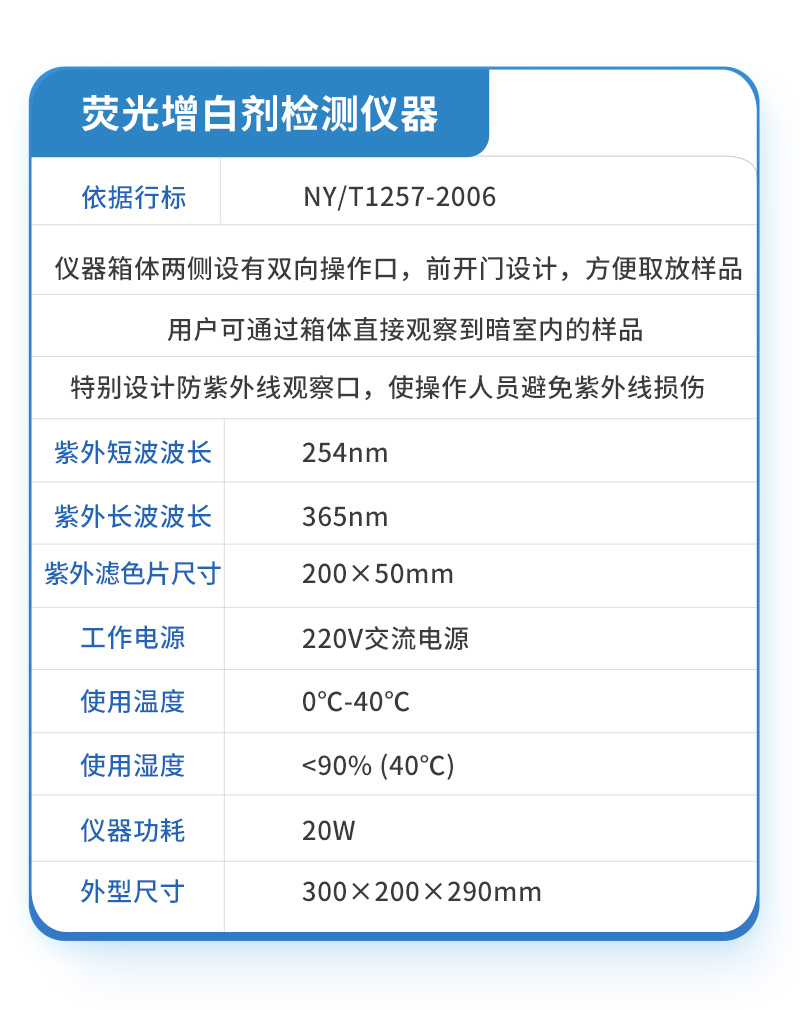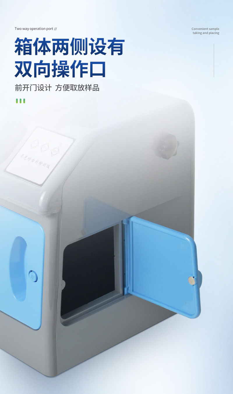 | ★依據行標:NY/T1257-2006 | ★儀器箱體兩側設有雙向操作口,前開門設計,方便取放樣品。 | ★用戶可通過箱體直接觀察到暗室內的樣品。 | ★特別設計防紫外線觀察口,使操作人員避免紫外線損傷。 | ★紫外短波波長:254nm | ★紫外長波波長:365nm | ★可見光源 | ★紫外濾色片尺寸:200×50mm | ★工作電源: 220V交流電源 | ★使用溫度: 0℃-40℃ | ★使用濕度: <90% (40℃) | ★儀器功耗: 20W | ★外型尺寸:300×200×290mm |