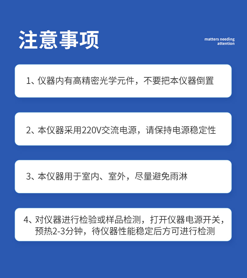 | 1. 儀器內有高精密光學元件,不要把本儀器倒置 | 2. 本儀器采用220V交流電源,請保持電源穩定性 | 3. 本儀器用于室內、室外,盡量避免雨淋 | 4. 對儀器進行檢驗或樣品檢測,打開儀器電源開關,需預熱2-3分鐘,待儀器性能穩定后方可進行檢測 |
