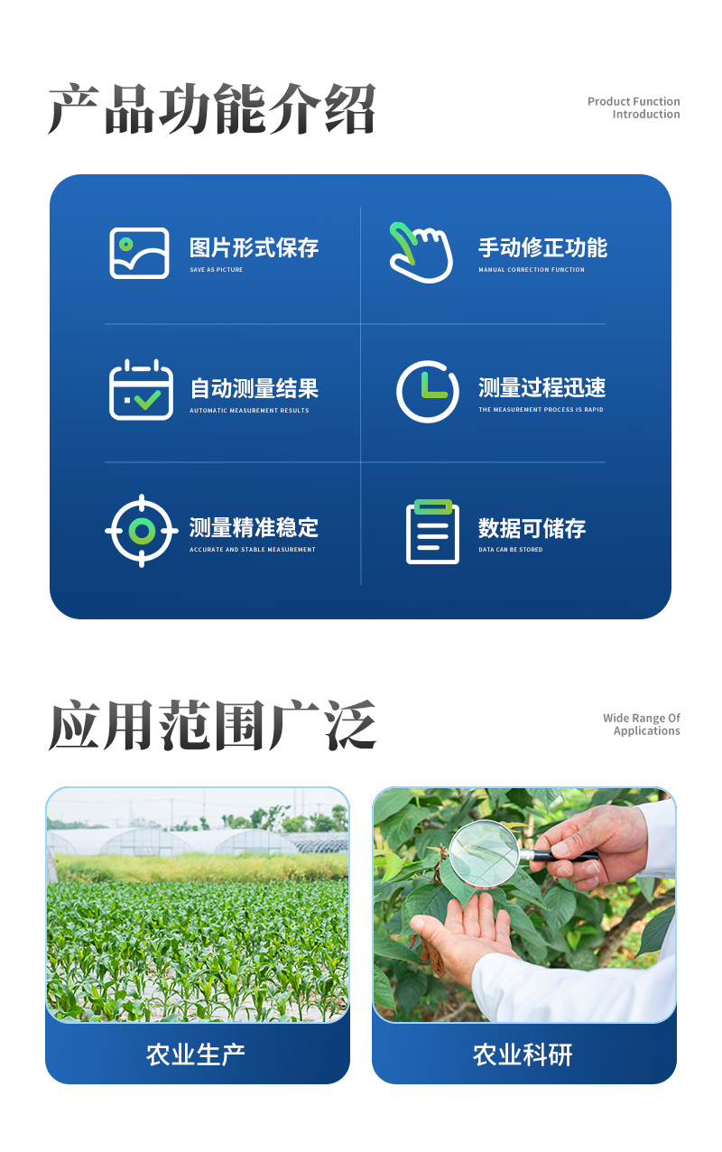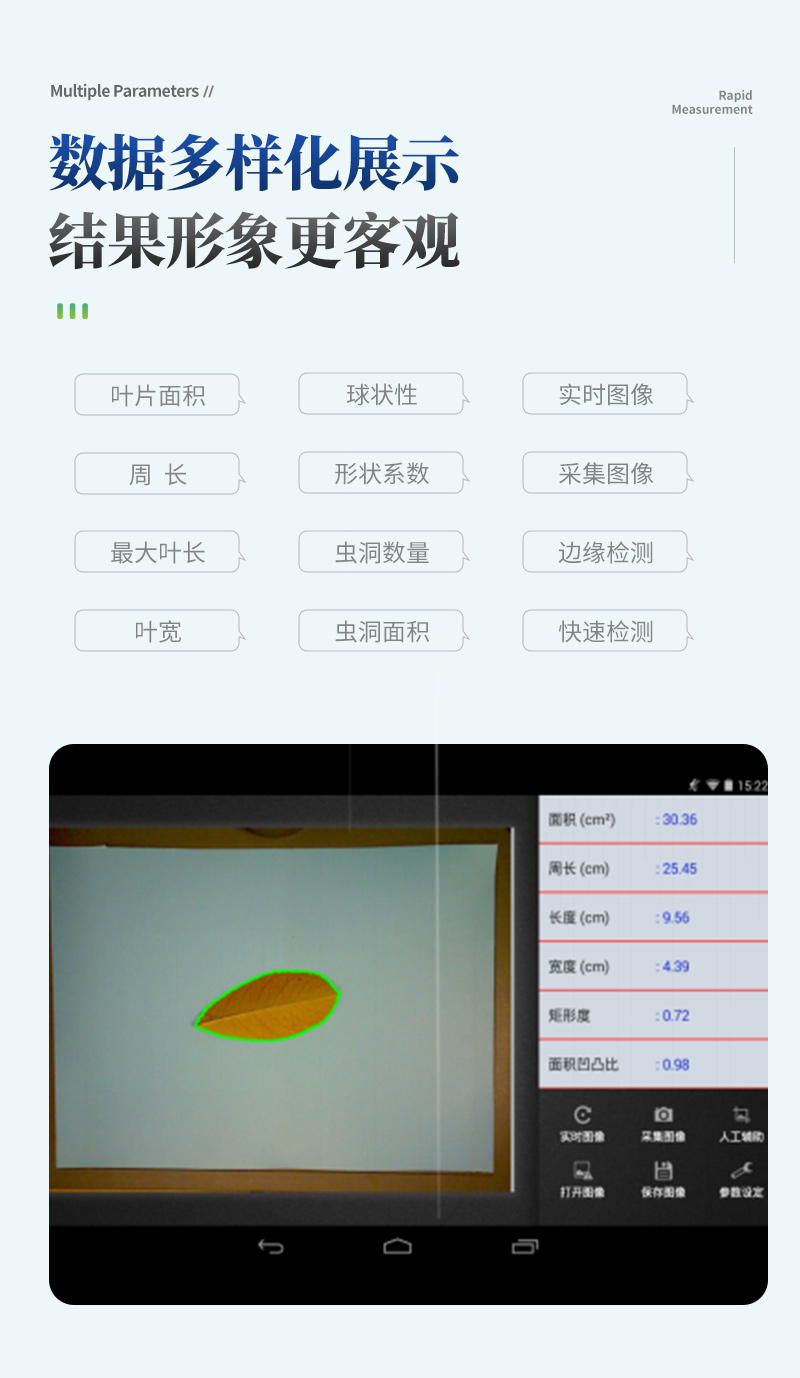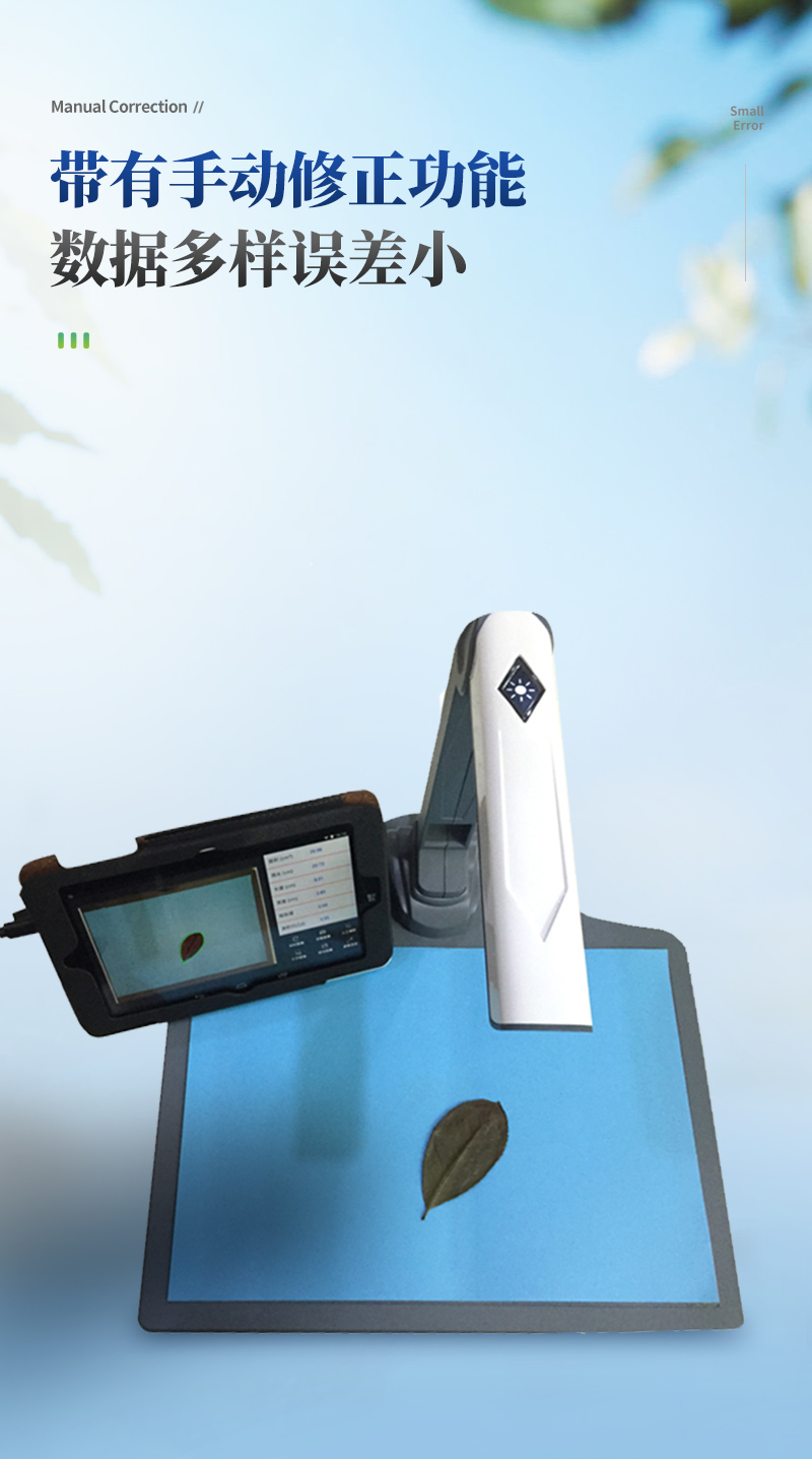 智能拍照式葉面積測量系統由圖像采集儀和裝入自主開發軟件的平板組成,采用本公司多年積累的面積測量算法,根據葉片輪廓特征提取、圖形實物轉換、邊緣檢測等技術,能夠形象并快速得到所測葉片面積、周長、蟲洞數量等參數。相比傳統的葉面積,具有測量更快速簡便、結果更形象客觀、數據多樣并大大減少了人為操作帶來的誤差。