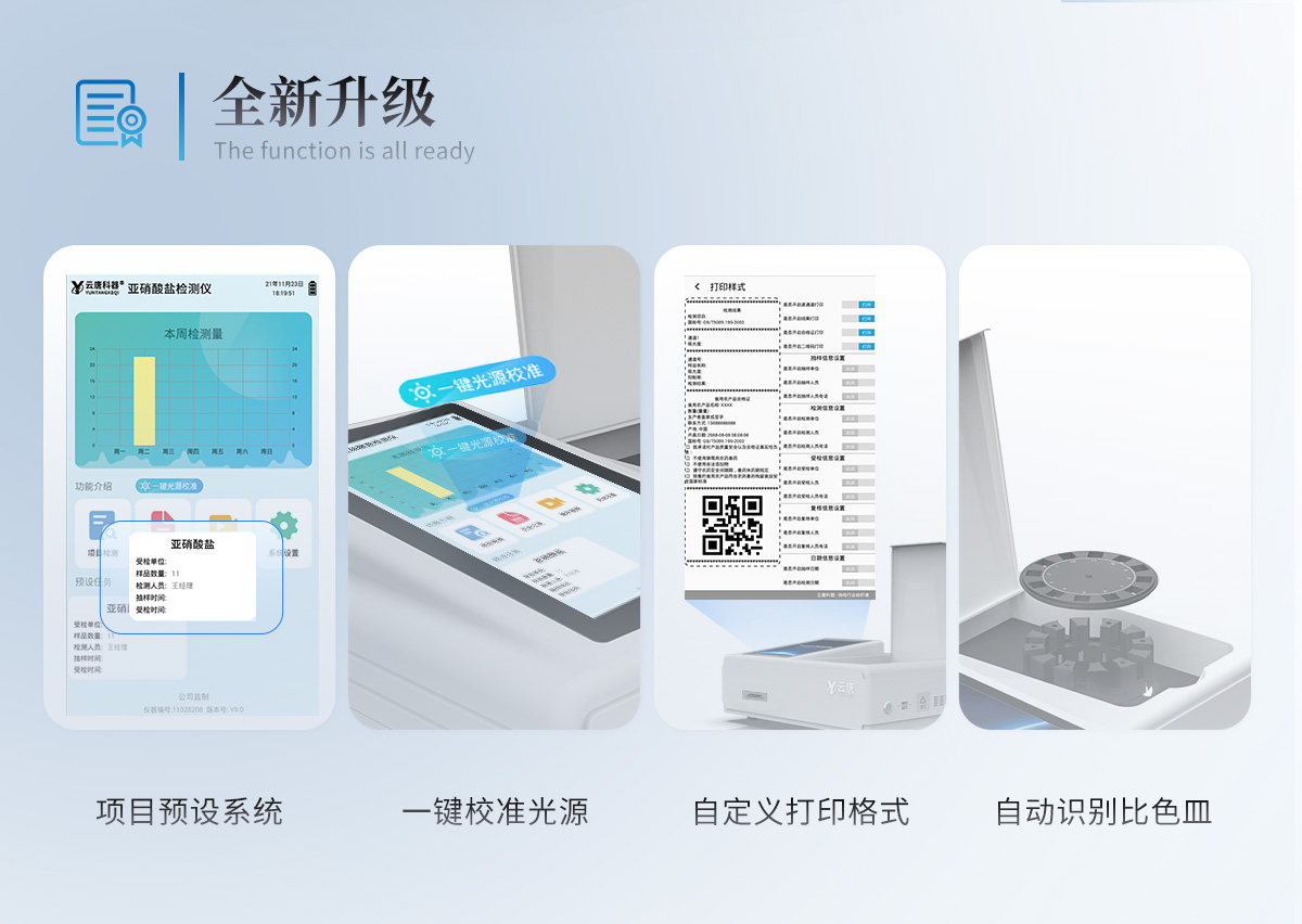 | 儀器采用臺式一體化系統檢測技術,將分光光度模塊、膠體金檢測模塊、新型農殘檢測模塊、數字化管理模塊、無線通訊模塊高度集成于一體,支持檢測200種食品安全檢測項目,同時預留升級檢測方法。 | 儀器檢測模塊標準化、智能化,可隨意自由組合。檢測箱體內置多個標準檢測單元,檢測模塊可以調整配置。 | 儀器采用全新安卓智能系統,主控芯片采用 ARM Cortex-A7,RK3288/4核處理器,10.1寸高清液晶觸摸豎屏,更加**的UI交互界面,運轉快捷;儀器配備無線通信模塊: 4G(APN)通訊模塊、Wifi模塊,藍牙傳輸,同時具有雙USB接口以及RJ45接口能以多種方式實現數據保存和數據傳輸功能。 | 創新檢測模式★檢測通道:≥12通道;采用精密旋轉比色池設計,使用同芯片同光源校準精度,解決不同光源之間的誤差值。1-12通道間誤差0.1%。(***:**202022821055.2) ★儀器具有自動識別比色皿檢測功能,即:將樣品比色皿放入儀器后,點擊樣品檢測,儀器自動識別比色皿進行通道檢測。 | 進口高精光源:高精度進口四波長冷光源,通道配置 410、520、590、630nm 波長光源,一個光源芯片驅動一個光源,誤差極小,每臺設備單獨**校準光源,**比對,同時參照四種不同波段光源全方位覆蓋市面上99%的農殘食品項目檢測。 | 膠體金模塊檢測方式:★采用COMS實時成像技術,可采集多個畫面,支持2個金標同時讀卡,通過不同顏色的灰度變化,一秒精準得出結果。 | 智能操作分析系統: | ★便捷操作系統:設備檢測時可在同一檢測界面自動對應相關檢測通道一次性選擇1-12個樣品名稱,無須退出界面,節省操作時間。(需提供對應證明) | ★數據集成系統:設備首頁自動統計檢測數據包含:周檢測數據、月檢測數據,全部檢測總數量,均包含檢測總數,合格數,不合格數,以及相關柱形分析圖,對各項檢測數據清晰掌握,無需電腦查詢,更加快捷直觀。(需提供對應證明文件) | ★項目預設系統:支持添加單個及多個相同或不相同的任務預設,一鍵快速調取,每一個任務分別可以設置不同的樣品、批次、編號、來源、備注、抽樣信息、檢測信息、受檢信息、復核信息等更多信息。無縫鏈接平臺和APP實時查看下發任務。(需提供對應證明文件) | ★數據監管系統:同步對接監管平臺,數據可局域網和互聯網數據上傳,檢測結果可選擇直接傳至食品安全監管平臺。集成OSS輸出存儲服務、區分設備定向管理應用,進行區域食品安全監管及大數據分析處理與數據統計,檢測區域食品安全長短期動態,達到食品安全問題預估、預警。(需提供對應食品理化分析系統計算機軟件著作權)。 | ★ 自定義打印系統:內置全新打印系統,新創自定義打印方式,可按需靈活設置開啟或關閉:產品合格證(國家農業部標準要求),二維碼,抽樣信息、檢測信息,受檢信息、復核信息、抽樣日期、檢測日期等信息的打印。(需提供對應證明) | ★系統遠程更新功能:可定向分客戶分儀器更新系統,按照不同客戶后期實際需求添加項目,無需機器返廠,即可遠程實時升級全新系統,節省時間成本及避免運輸造成設備損壞。 | 儀器主機采用一體化防水、抗壓、防撞擊、防腐蝕箱體設計,同時配備交直流供電,可連接車載電源,可選配大容量充電鋰電池,滿足現場野外檢測需求。 | 安全證書,放心保障:儀器具有中國計量科學研究院校準證書,權威認證。 |