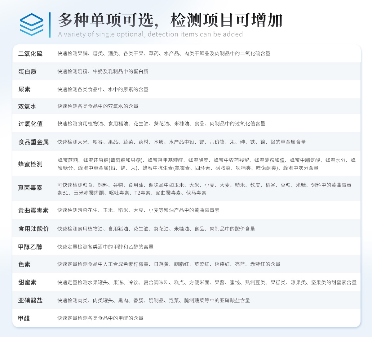 | 食品添加劑:二氧化硫、雙氧水、亞硝酸鹽、硝酸鹽、苯甲酸鈉、山梨酸鉀、糖精鈉、甜蜜素、木耳硫酸鎂等 | 有毒有害物質:甲醛、吊白塊、硼砂、過氧化苯甲酰、溴酸鉀、羅丹明B、三聚氰胺、蘇丹紅、工業堿、尿素、明礬等 | 果蔬:農藥殘留(酶抑制率法) | 病害肉:組胺、揮發性鹽基氮 | 重金屬含量:鉛、鎘、鉻、汞、砷、錫、鎳、鋁等 | 水酒飲品分析:酒中甲醇、乙醇、乳品及牛奶中蛋白質 | 調味品成分: 食醋的總酸、醬油的總酸、芝麻油純度、谷氨酸鈉、醬油氨基酸態氮、食鹽中亞鐵氰化鉀、食鹽中碘等 | 食用色素類:紅色色素(胭脂紅、莧菜紅、莧菜紅)、黃色色素(檸檬黃、日落黃)、藍色色素(亮藍)等 | 蜂蜜成分:果糖和葡萄糖、蔗糖、淀粉酶、酸度等 | 食用油脂:過氧化值、酸價等 |