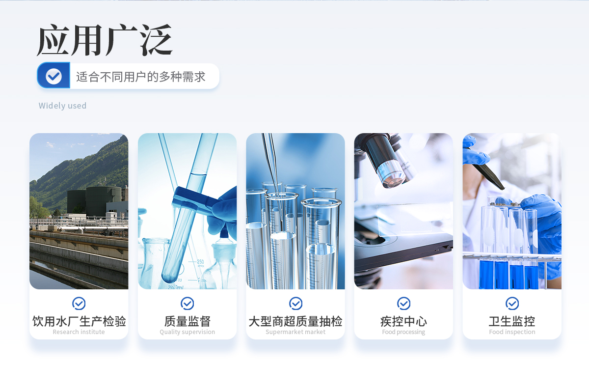 能夠廣泛的應(yīng)用于飲用水廠生產(chǎn)檢驗、市場監(jiān)督部門質(zhì)量監(jiān)督、大型商超質(zhì)量抽檢、疾病控制中心、衛(wèi)生監(jiān)控等。
