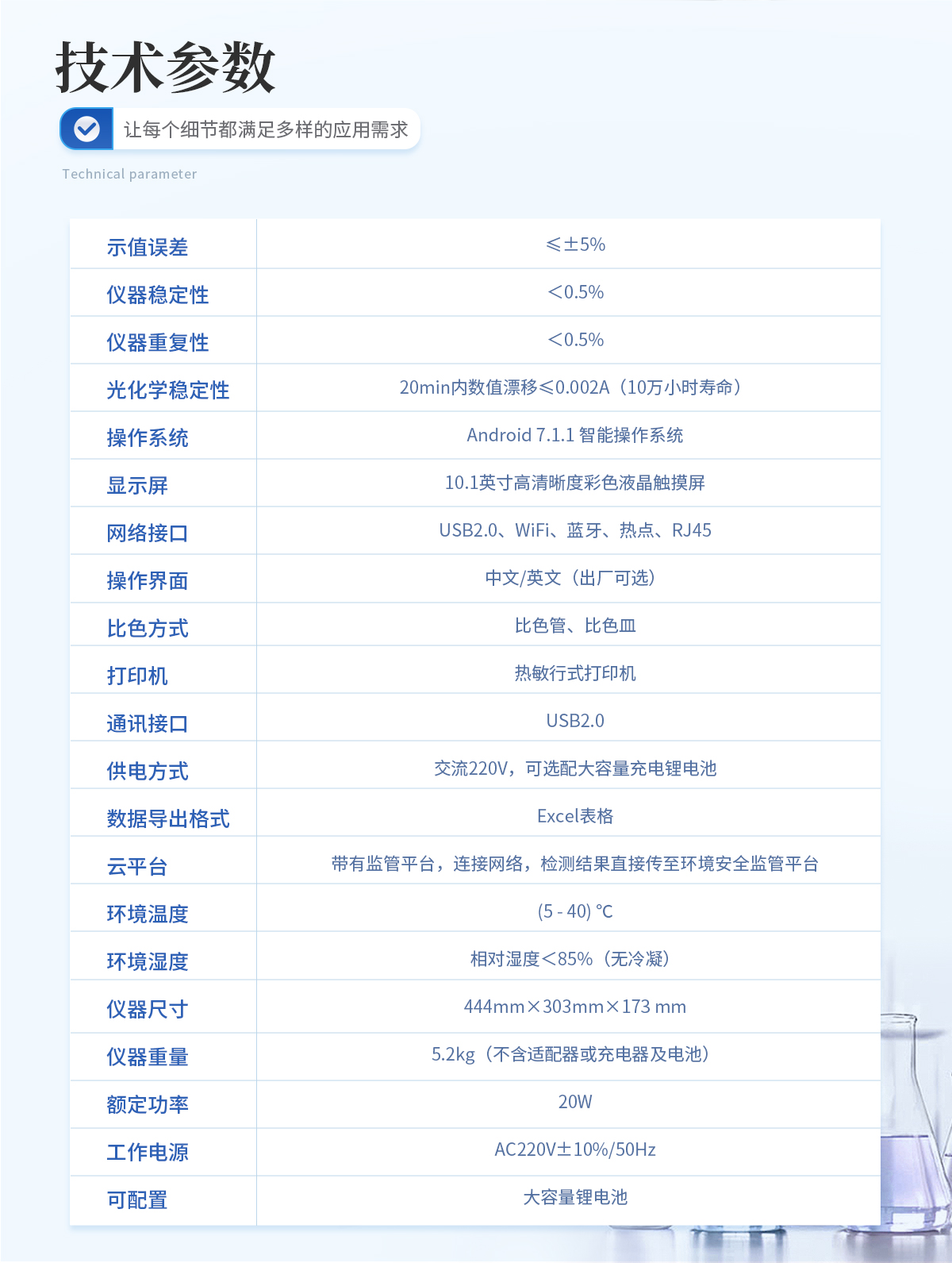 | 示值誤差:≤±5%; | 儀器穩(wěn)定性:<0.5%; | 儀器重復(fù)性:<0.5%; | 光化學(xué)穩(wěn)定性:20min內(nèi)數(shù)值漂移≤0.002A(10萬小時壽命); | 檢測量程:0.004-0.05mg/L; | 檢測下限:0.004mg/L; | 分辨率:0.001mg/L; | 比色方式:支持10mm、30mm、40mm、50mm皿比色和φ16mm管比色等比色方式 | 操作系統(tǒng):Android7.1.1智能操作系統(tǒng); | 操作界面:中文或英文操作界面; | 顯示屏:10.1英寸高清晰度彩色液晶觸摸屏; | 網(wǎng)絡(luò)接口:USB2.0、HDMI、WiFi、藍(lán)牙、熱點、RJ45; | 云平臺:儀器帶有監(jiān)管平臺,連接有線/無線網(wǎng)絡(luò),檢測結(jié)果直接傳輸至環(huán)境安全監(jiān)管平臺; | 打印機(jī):熱敏行式打印機(jī); | 數(shù)據(jù)儲存:800萬組,可自由調(diào)用查看; | 數(shù)據(jù)導(dǎo)出格式:Excel表格; | 儀器尺寸:367x243x125mm; | 儀器重量:5.3kg; | 環(huán)境溫度:(5-40)℃; | 環(huán)境濕度:相對濕度<85%(無冷凝); | 額定功率:10W; | 工作電源:AC220V±10%/50Hz; | 可配置:大容量鋰電池。 |