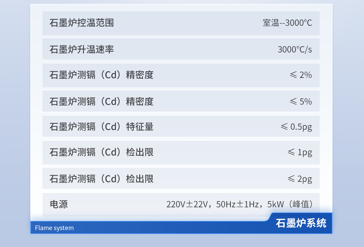 2、 石墨爐控溫精度高,升溫速度快 采用大功率變壓器、微阻電纜線以及光控升溫方式,并配合軟件、硬件溫度校正系統,高溫段控溫精度可達±1%。 |