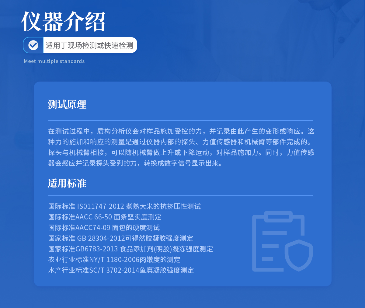 | 國際標準 IS011747-2012 煮熟大米的抗擠壓性測試 | 國際標準AACC 66-50 面條堅實度測定 | 國際標準AACC74-09 面包的硬度測試 | **** GB 28304-2012可得然膠凝膠強度測定 | ****GB6783-2013 食品添加劑(明膠)凝凍強度測定 | 農業行業標準NY/T 1180-2006肉嫩度的測定 | 水產行業標準SC/T 3702-2014魚糜凝膠強度測定 |