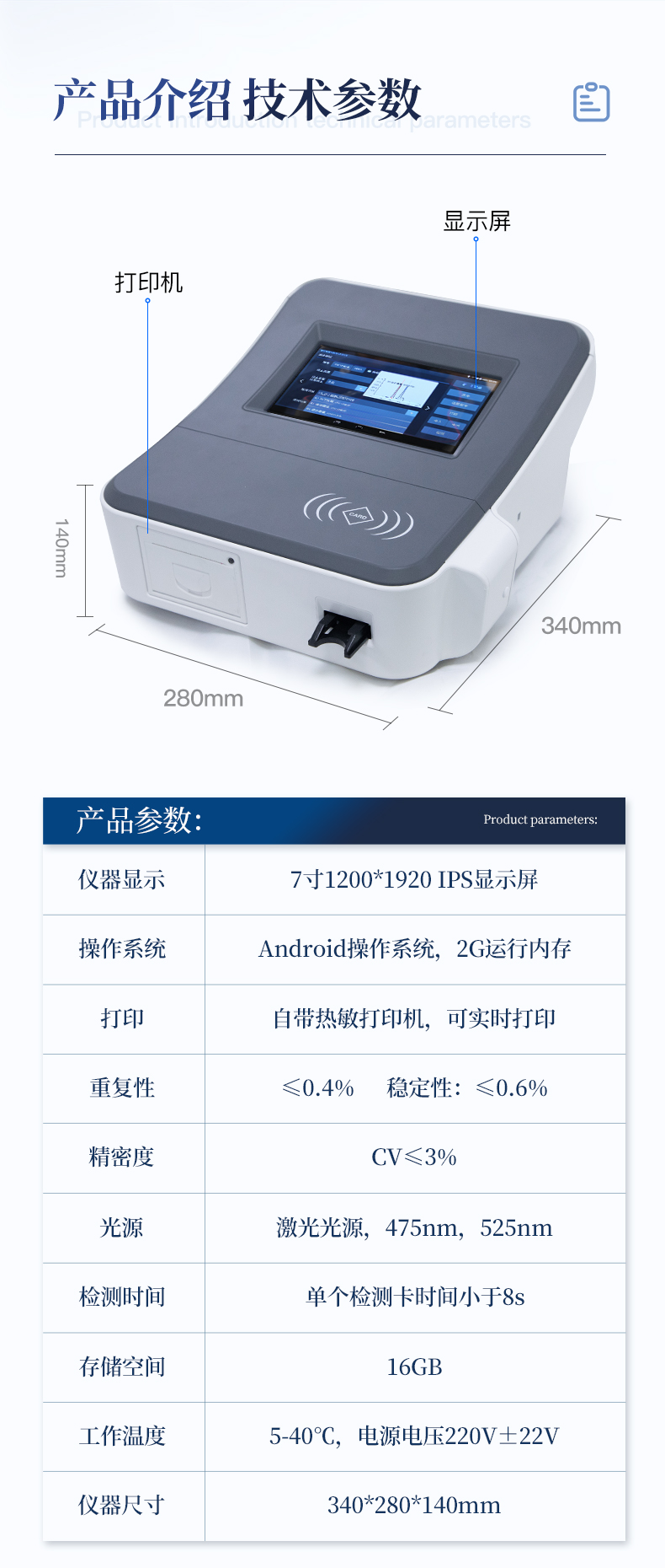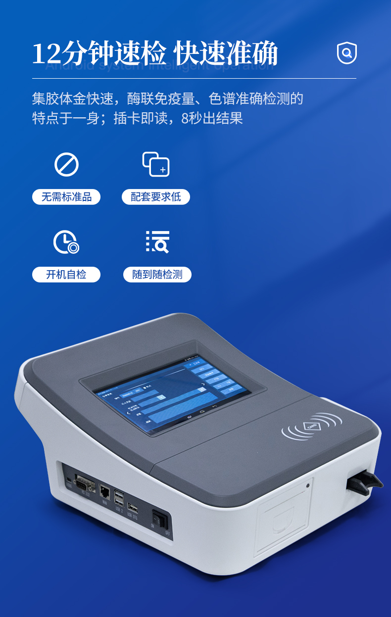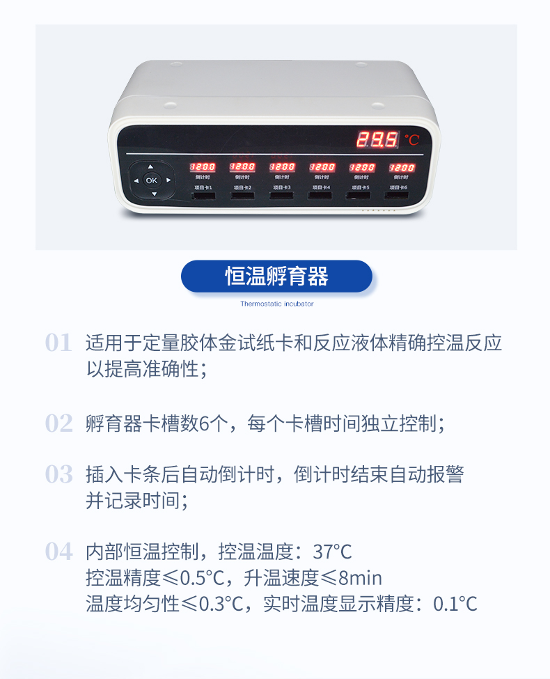 | 1、儀器自動(dòng)識別檢測卡條形碼上的檢測項(xiàng)目、樣本類型、檢測限、標(biāo)準(zhǔn)曲線,形成完整的檢測數(shù)據(jù)信息鏈。一卡一控,插卡后儀器自動(dòng)讀取檢測卡顯示的C、T線的熒光信號,依據(jù)檢測卡內(nèi)置的標(biāo)準(zhǔn)曲線,自動(dòng)計(jì)算結(jié)果;用戶可根據(jù)自身需求,選擇設(shè)定檢測限/定量限(內(nèi)控或****限量)。 | 2、檢測數(shù)據(jù)信息采集項(xiàng)目(包括但不限于):儀器至少支持以下檢測數(shù)據(jù)采集:①檢測項(xiàng)目;②樣本類型;③檢測樣本;④國家限量;⑤檢測者;⑥檢測單位;⑦檢測時(shí)間;⑧檢測線/定量限;⑨檢測編號;⑩內(nèi)控限量 樣本來源等,并支持?jǐn)?shù)據(jù)采集項(xiàng)目遠(yuǎn)程擴(kuò)展升級。 | 3、檢測數(shù)據(jù)采集方式:檢測數(shù)據(jù)信息采集項(xiàng)目中載明的:①-⑨項(xiàng)為儀器自動(dòng)識別采集,⑩項(xiàng)為手寫輸入。 | 4、檢測數(shù)據(jù)上傳方式:完成檢測后,儀器能自動(dòng)將檢測數(shù)據(jù)信息采集項(xiàng)目載明的全部檢測數(shù)據(jù)信息上傳至檢測監(jiān)管系統(tǒng)平臺(tái)。 | 5、接口:藍(lán)牙通訊接口;內(nèi)置無線WIFI,檢測數(shù)據(jù)實(shí)時(shí)傳輸?shù)綌?shù)據(jù)監(jiān)管平臺(tái),客戶可通過賬號登陸在網(wǎng)絡(luò)上實(shí)時(shí)查看檢測數(shù)據(jù) | 6、存儲(chǔ)空間:存儲(chǔ)空間16GB。 | 7、信息輸入:支持中英文手寫輸入。 | 8、本機(jī)數(shù)據(jù)管理:具有檢測數(shù)據(jù)存儲(chǔ)、查詢,批量數(shù)據(jù)刪除和打印等功能。 | 9、檢測項(xiàng)目管理:儀器支持檢測項(xiàng)目及對應(yīng)國家限量遠(yuǎn)程增加、刪除等維護(hù)管理。 | 10、操作權(quán)限管理:儀器支持檢測操作人員使用賬號、密碼登陸儀器的功能,支持賬號、密碼在監(jiān)管系統(tǒng)平臺(tái)進(jìn)行驗(yàn)證。 | 11、在線學(xué)習(xí):內(nèi)置檢測項(xiàng)目操作流程簡圖,教學(xué)軟件可實(shí)時(shí)在線更新。 | 12、工作溫度:5-40℃,相對濕度:10%-90%。電源電壓220V±22V,頻率50Hz±1Hz,額定功率40W,與電源的連接方式:可拆卸電源線。 | 13、恒溫孵育器 | (1)適用于定量膠體金試紙卡和反應(yīng)液體準(zhǔn)確控溫反應(yīng),以提高準(zhǔn)確性; | (2)孵育器卡槽數(shù)6個(gè),每個(gè)卡槽時(shí)間獨(dú)立控制; | (3)插入卡條后自動(dòng)倒計(jì)時(shí),倒計(jì)時(shí)結(jié)束自動(dòng)報(bào)警,并記錄超時(shí)時(shí)間; | (4)內(nèi)部恒溫控制,控溫溫度:37℃,控溫精度≤0.5℃,升溫速度≤8min,溫度均勻性≤0.3℃,實(shí)時(shí)溫度顯示精度:0.1℃。 |