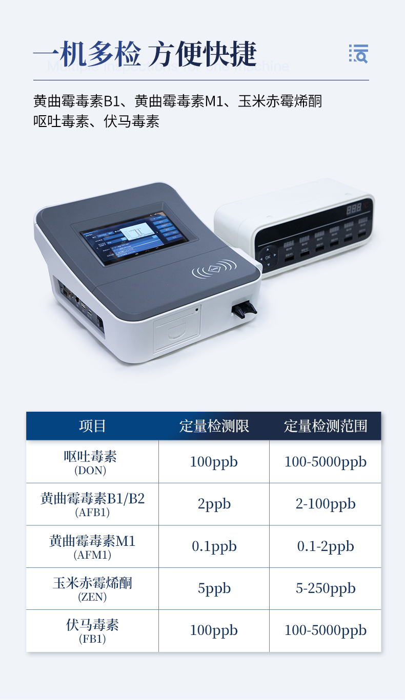 真菌毒素?zé)晒舛糠治鰞x可快速檢測糧食、飼料、谷物、食用油、調(diào)味品中如玉米、大米、小麥、大麥、糙米、麩皮、稻谷、豆粕、米糠、飼料中的黃曲霉毒素B1、黃曲霉毒素M1、玉米赤霉烯酮、嘔吐毒素、伏馬毒素,杜絕毒素污染,維護(hù)食品安全。