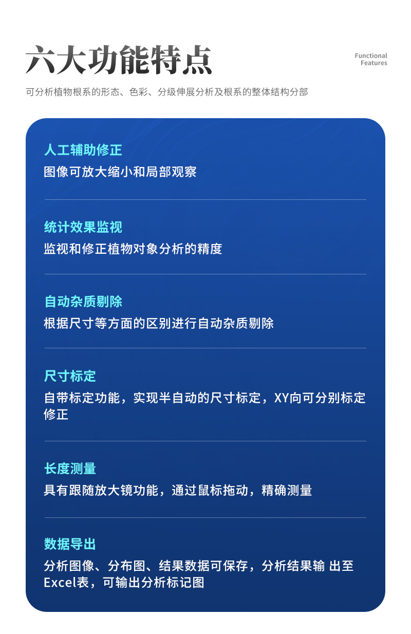 本軟根系分析軟件可以讀取TIFF,JPEG標準格式的圖像。針對獲取的圖像,利用插入加密狗解密的軟件,對掃描獲得的高質量根系圖像進行分析。采用非統計學方法測量計算出交叉重疊部分根系長度、直徑、面積、體積、根尖等基本的形態學參數。從而滿足研究者針對植物根系不同類別和層次的研究。
